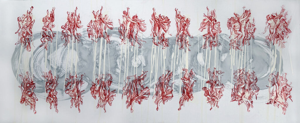 Gesture drawings of Soldini’s Apollo and Daphne arranged in a linear sequence above with their mirrored counterparts below. Fluid connective marks bridge the two fields, suggesting transmission between myth and embodiment, consciousness and instinct—how archetypal narratives move through bodies, memory, and time rather than remaining fixed or distant.