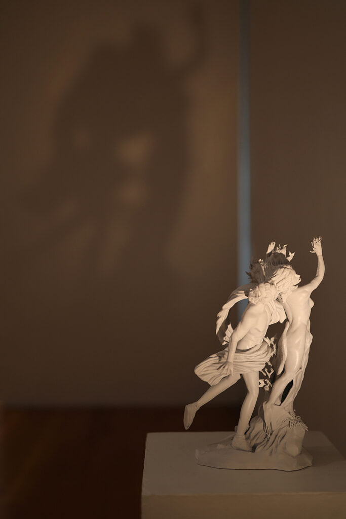 This installation uses a projected 3-D print of Bernini’s Apollo and Daphne to invoke Plato’s Allegory of the Cave, where shadows stand in for truth. The work reflects our collective inability to fully see—or to acknowledge—how sexual violence permeates society, revealing how myth, beauty, and projection can obscure lived harm even as it persists all around us.