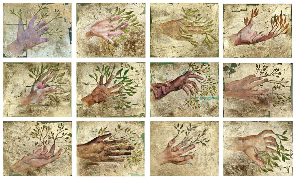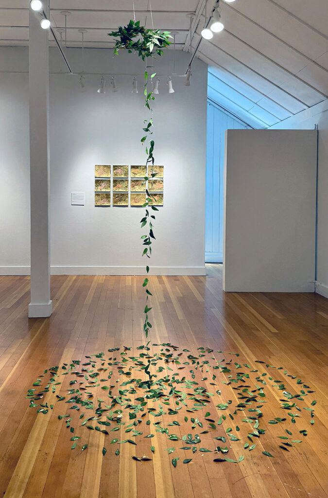 Survivor poetry is inscribed onto falling laurel leaves, fracturing language and dispersing it into space. Bits of 24k gold leaf scatters and is carried by viewers’ movements implicating them in reclaiming Apollo’s emblem of poetic authority, transforming the laurel from a symbol forged through violence into an embodied, communal archive of testimony and endurance.