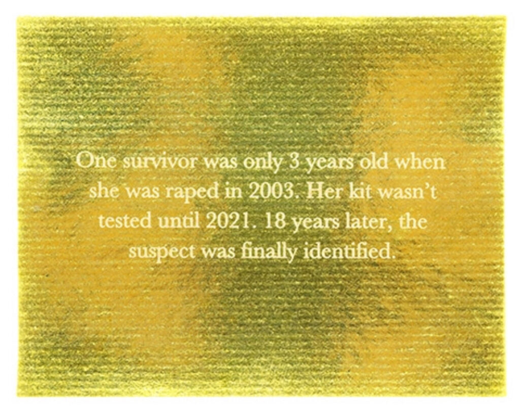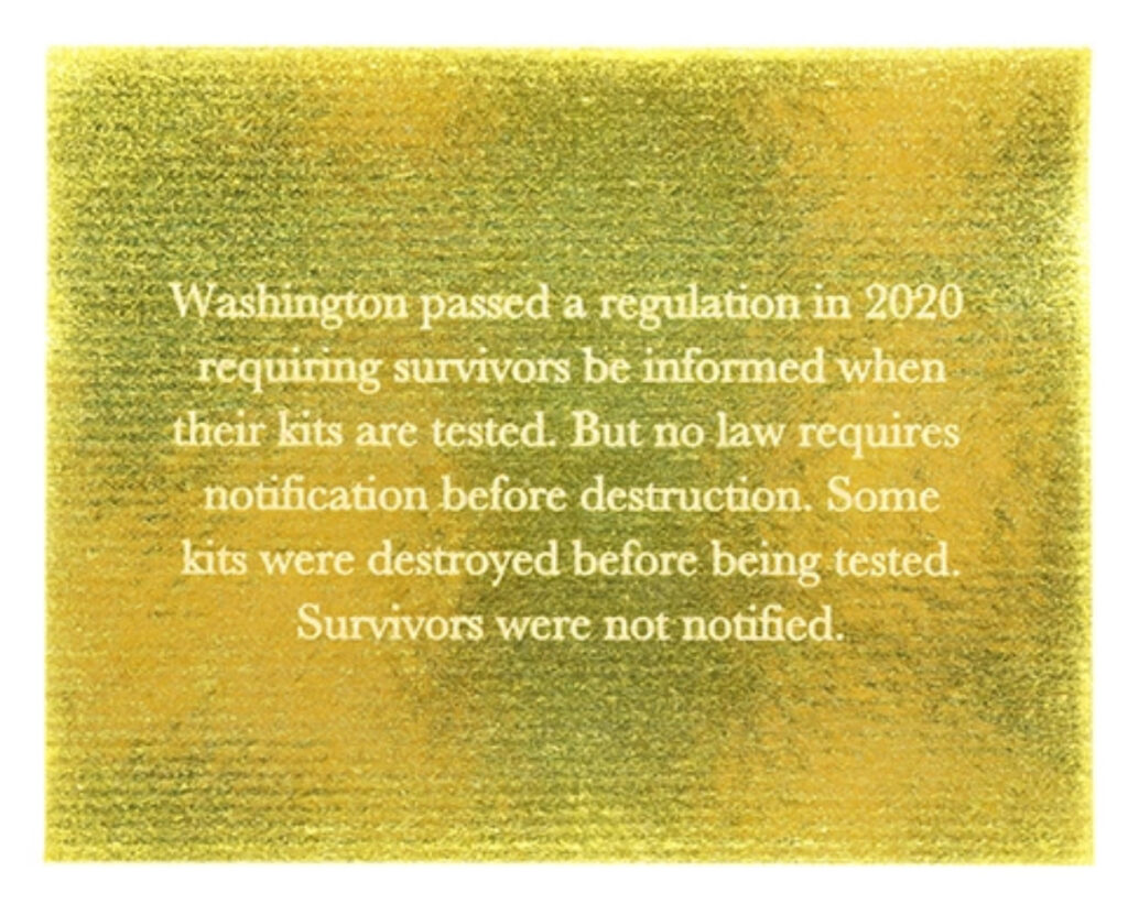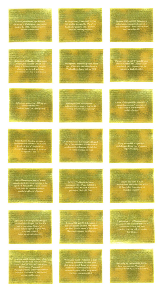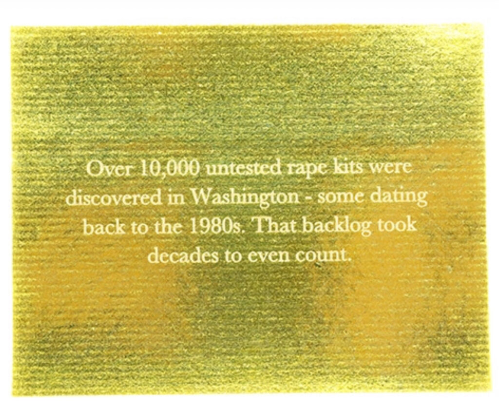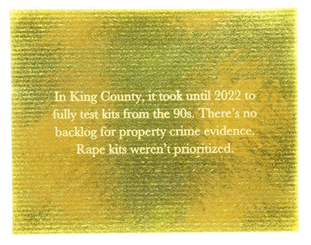 This laser etched edition responds to Washington State’s clearing of a backlog of over 10,000 rape kits, using three pillars of gold-foil prayer sheets to mark the 21 cases solved to date. By activating only half of the state’s six investigative pillars, the installation exposes how justice remains partial and delayed, revealing systemic neglect that allows violence to persist unseen. Details of some etchings below.