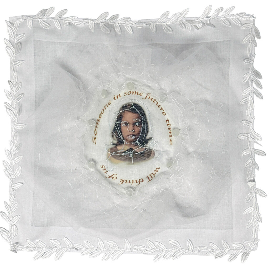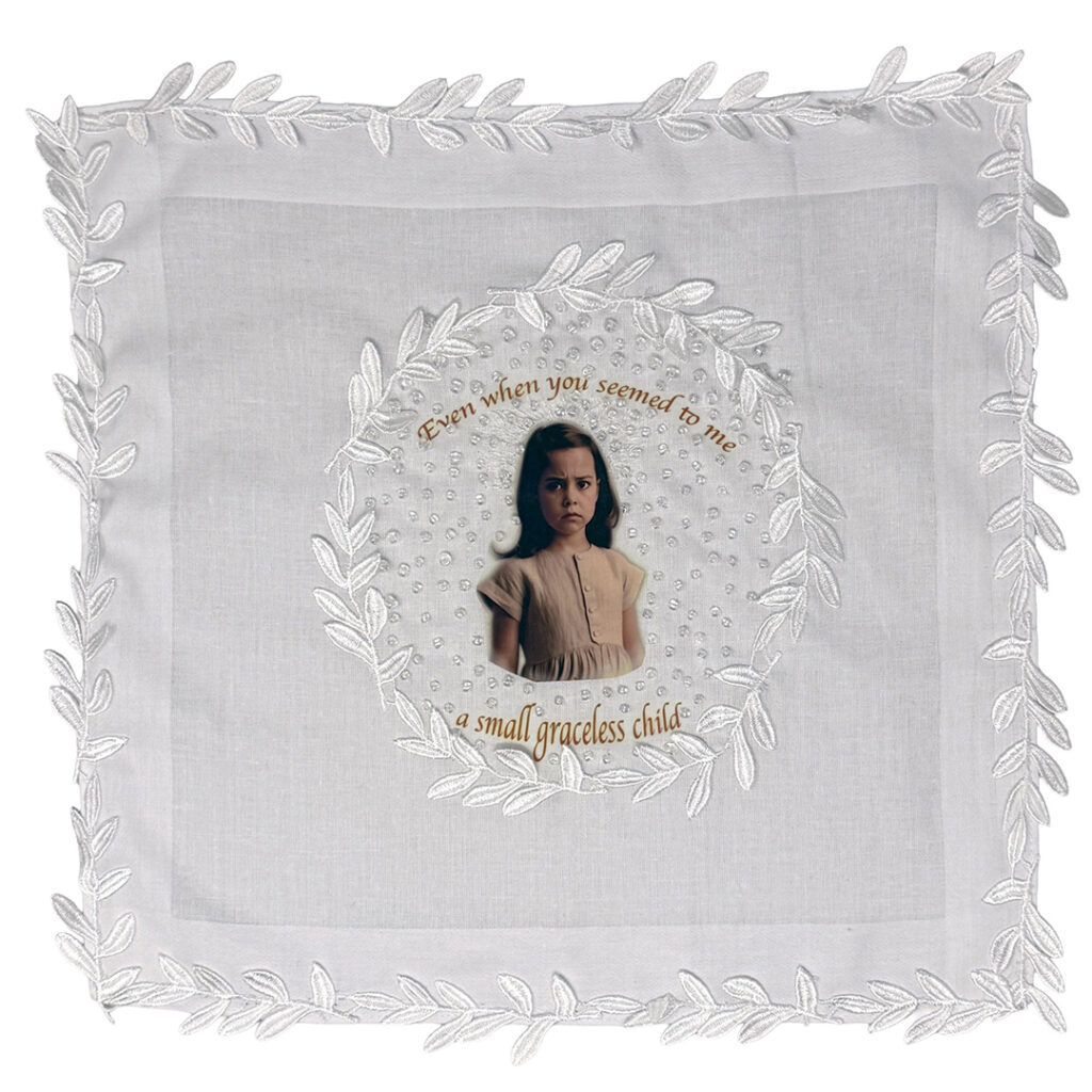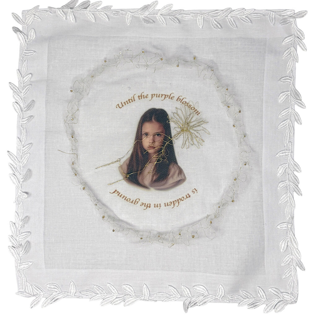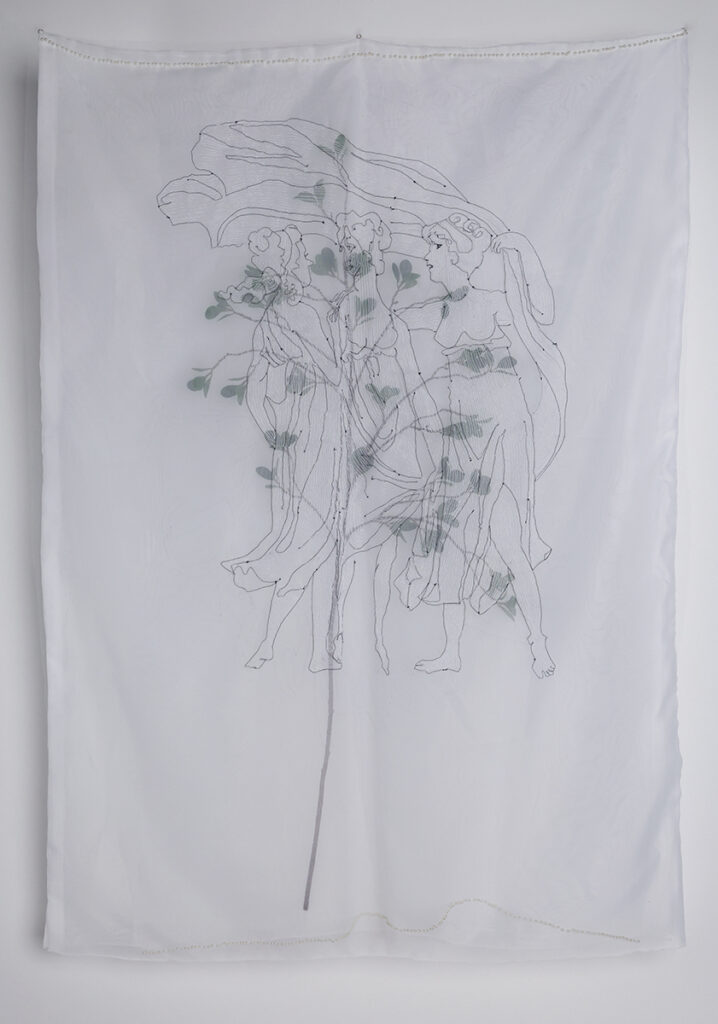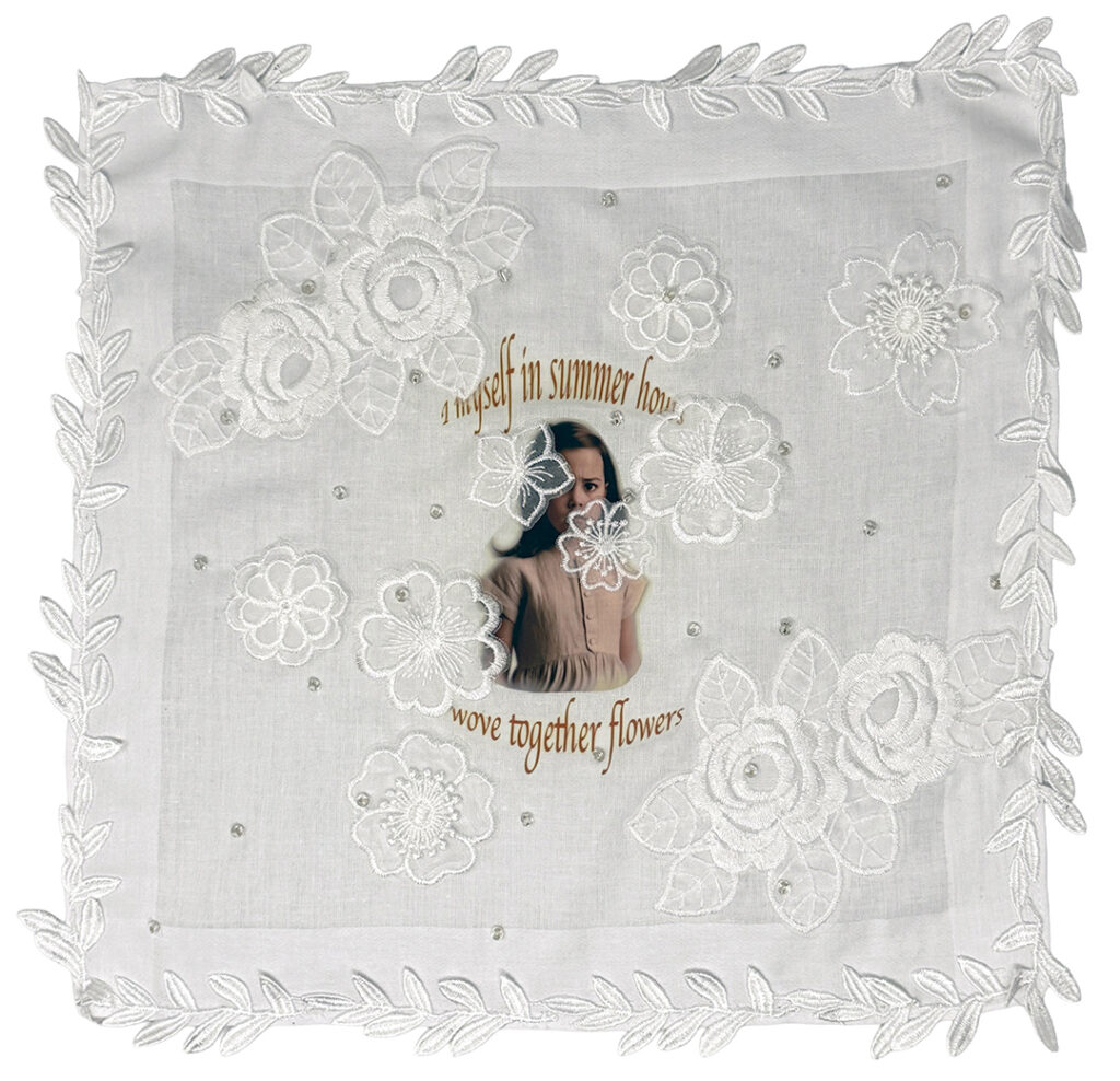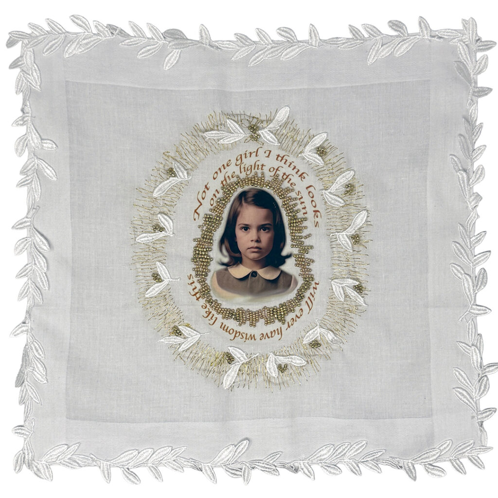 These commemorate my childhood brush with sexual violence. Fragments of Sappho’s poetry situate hand-embroidered handkerchiefs with a lineage of female expression that persists despite historical silencing. The poet’s voice speaks in a register that mirrors the interior world of survivors processing trauma. Laurel-leaf borders connect these intimate acts of mourning to the myth of Apollo and Daphne. Details of each handkerchief below.