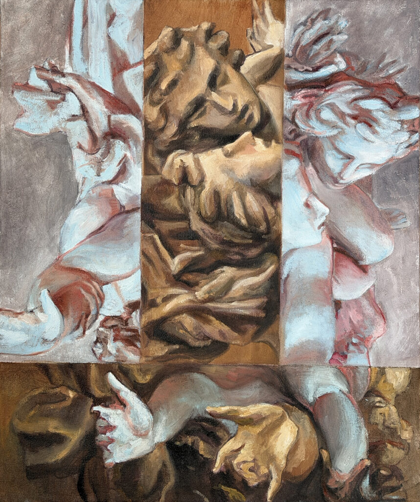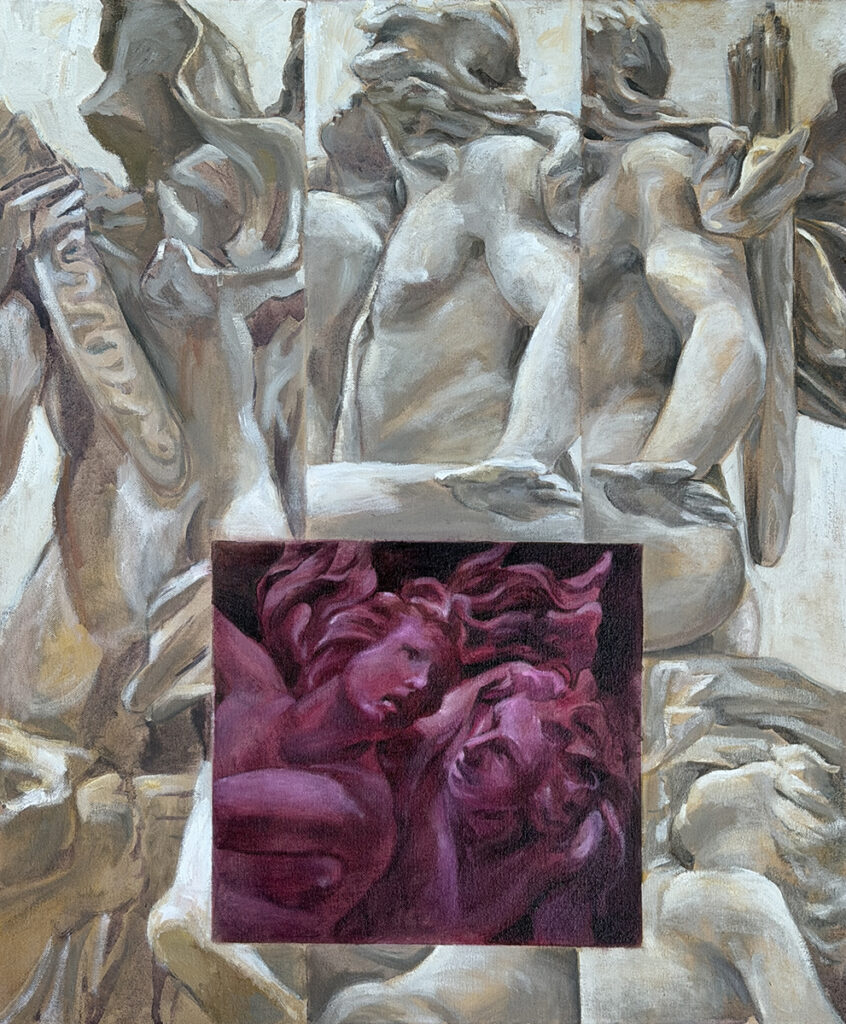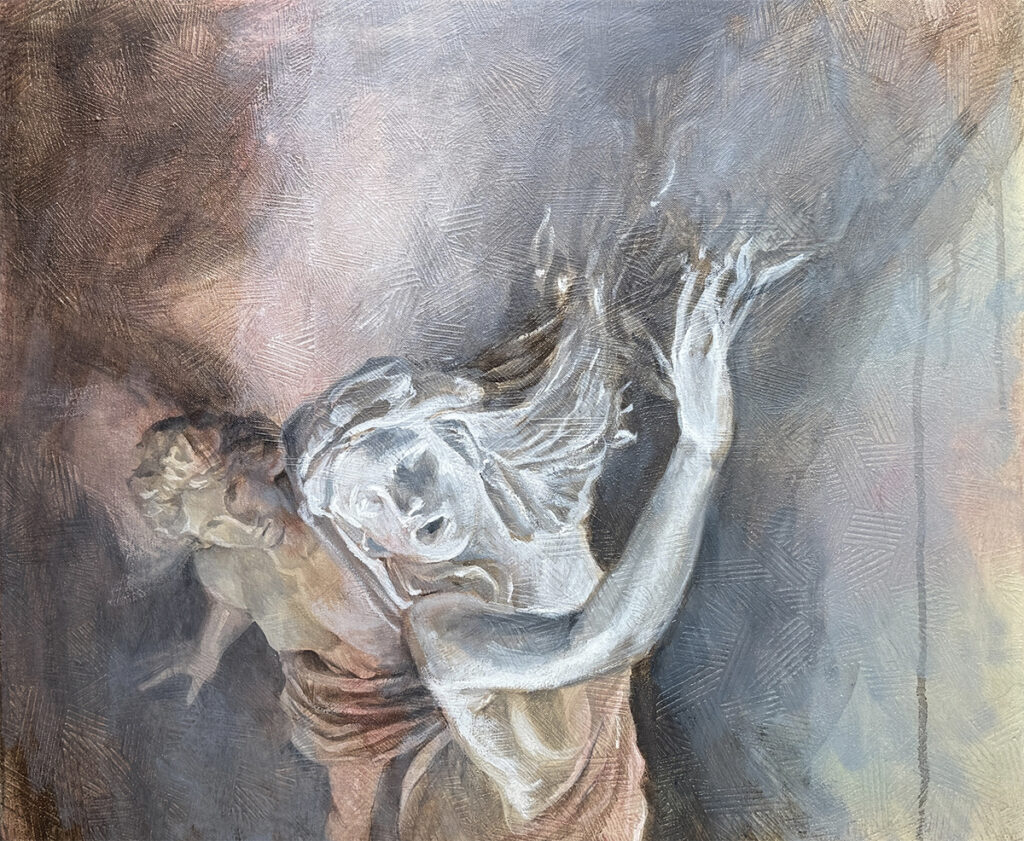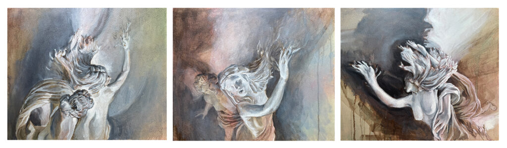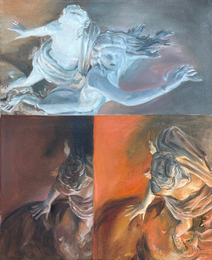 My work is grounded in the belief that myth is not static but psychologically alive—capable of holding contradictions that resist resolution. Recently the Apollo and Daphne archetype preoccupies my inquiries. Rather than illustrating the myth, I repeatedly engage and fracture it, focusing on moments of pursuit, refusal, and metamorphosis. Daphne’s transformation becomes a site of tension: an act of agency that is also marked by loss, raising questions about protection, autonomy, and erasure. Engagement with process may speed up or slow down a point of instability, where meaning is not resolved but felt.